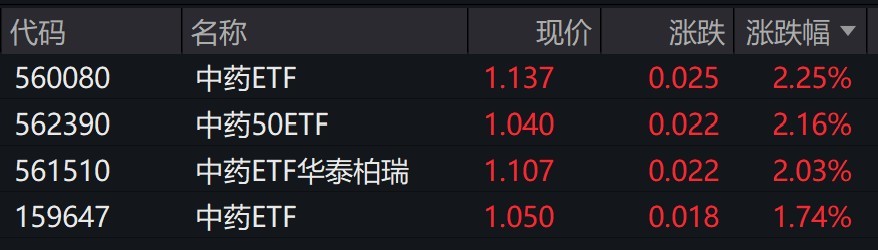 每经记者|叶峰 每经编辑|肖芮冬 中药概念股早盘走强,同仁堂、佐力药业涨超2%。 受盘面影响,跟踪中证中药指数的ETF涨约2%。