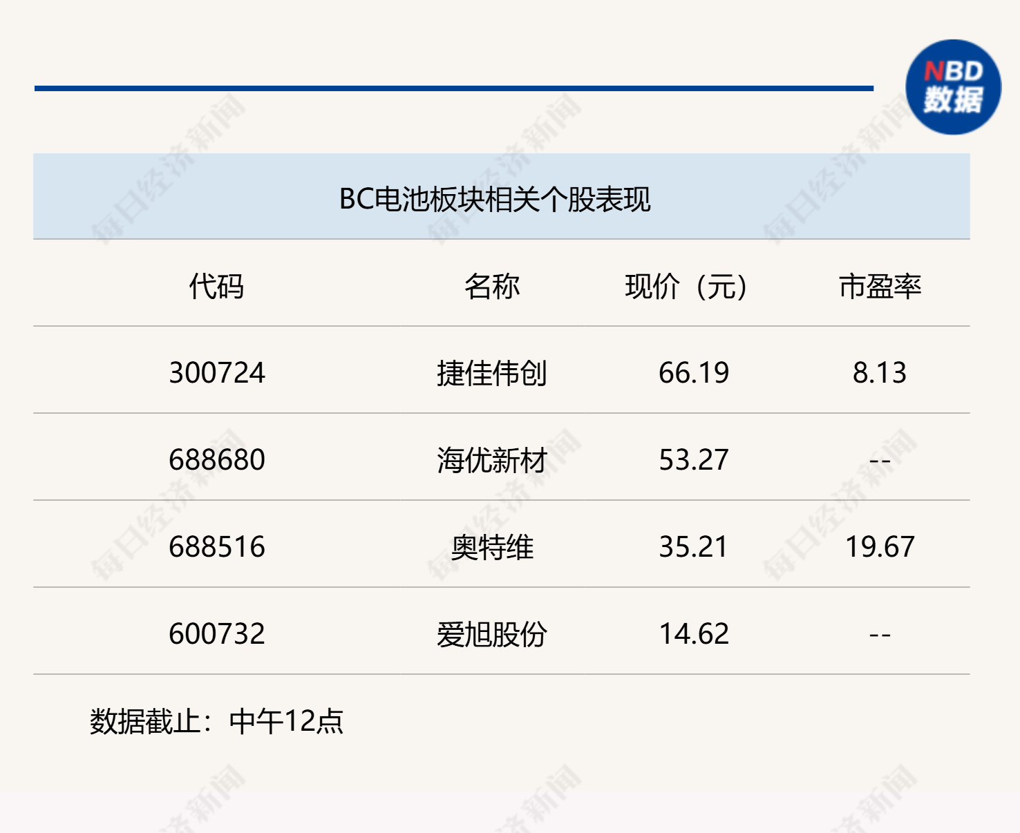 每经记者|刘明涛 每经编辑|叶峰 8月1日,A股震荡走低,截至上午收盘,上证指数午盘跌0.19%报3566.55点,深证成指跌0.15%,创业板指跌0.16%,北证50涨0.11%,科创50跌0.84%,中证A500跌0.26%,A股半日成交1.01万亿元。 资金面,央行公告称,8月1日以固定利率、数量招标方式开展了1260亿元7天期逆回购操作,操作利率1.40%,投标量1260亿元,中标量1260亿元。 消息面,工业和信息化部办公厅印发《2025年度多晶硅行业专项节能监察任务清单》的通知,请各地工业和信息化主管部门按照《通知》要求抓紧组织实施,于9月30日前报送监察结果。在工业节能监察过程中,要进一步规范工业节能监察程序措施,切实减轻企业负担。 板块方面,创新药题材继续强势,光伏产业链震荡走高。 当前BC技术电池量产批次平均转换效率达27%以上,组件量产效率全面突破24%。主流版型双面双玻组件功率达665W,较传统及升级后的TOPCon组件分别有30W、15W增益,且在低衰减、抗隐裂、低温度系数、弱光性能等方面具优势。未来3-5年内,通过导入光管理、双极复核钝化和新型的先进的金属化等提效手段,BC电池效率有望达28.5%,带动组件效率突破26%,保持领先地位。 这里,通过整合多家券商最新研报信息,介绍4家公司,仅供参考。 1、捷佳伟创 公司作为光伏设备龙头之一,在光伏技术路线上实现了全覆盖,未来行业变革时公司有望充分受益。另外,公司在保持原有优势的背景下,积极开拓半导体/锂电设备等新领域,完善平台化布局,长期业绩有所保障。 2、海优新材 随着公司调光膜在汽车领域的推广及小批量使用,产业化能力取得明显进步,产成品率提升及规模化将带来持续的降本,有望较快提升调光天幕及车窗的渗透率,同时为公司带来收入增长和盈利能力的提升。 3、奥特维 公司作为光伏设备龙头,技术储备深厚,尤其在串焊机领域具备领先优势,有望受益于未来0BB等技术的迭代升级和存量改造需求。同时,公司平台化布局逐步完善,单晶炉业务已形成有力支撑,海外市场拓展和半导体业务有望贡献新的增长动力。 4、爱旭股份 公司作为BC新技术领先企业,有望凭借技术溢价+海外高价值市场溢价,率先迎来量利齐升,打开后续增长空间。 |