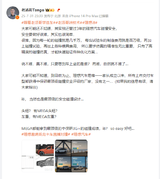 稍晚时候,理想汽车产品负责人@老汤哥Tango 再回应此事,他表示,到目前为止、理想汽车是唯一一家从成立以来,所有上市交付车型都获得中保研最顶级碰撞安全评级的厂家,没有之一…i8, 当然也是最顶级的安全碰撞设计…头短? 有MEGA头短?车重,有MEGA车重?“MEGA都能拿到最顶级的中保研3G+的碰撞成绩,i8? so easy 好吧…”