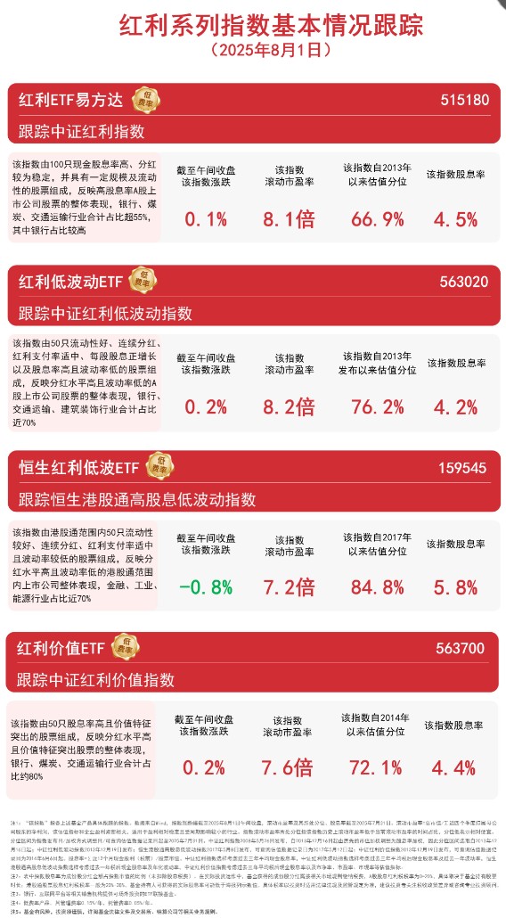 截至午间收盘,中证红利价值指数、中证红利低波动指数均上涨0.2%,中证红利指数上涨0.1%,恒生港股通高股息低波动指数下跌0.8%。Wind数据显示,恒生红利低波ETF(159545)7月获15亿元净流入,最新规模近40亿元、创成立以来新高。
