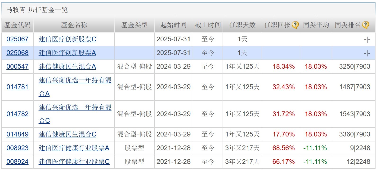2.基金简称:建信医疗创新股票 基金类型:股票型证券投资基金 基金经理:马牧青 业绩比较基准:中证医药卫生指数收益率*70%+中债综合指数收益率*15%+恒生医疗保健指数收益率*15% 基金经理过往业绩: