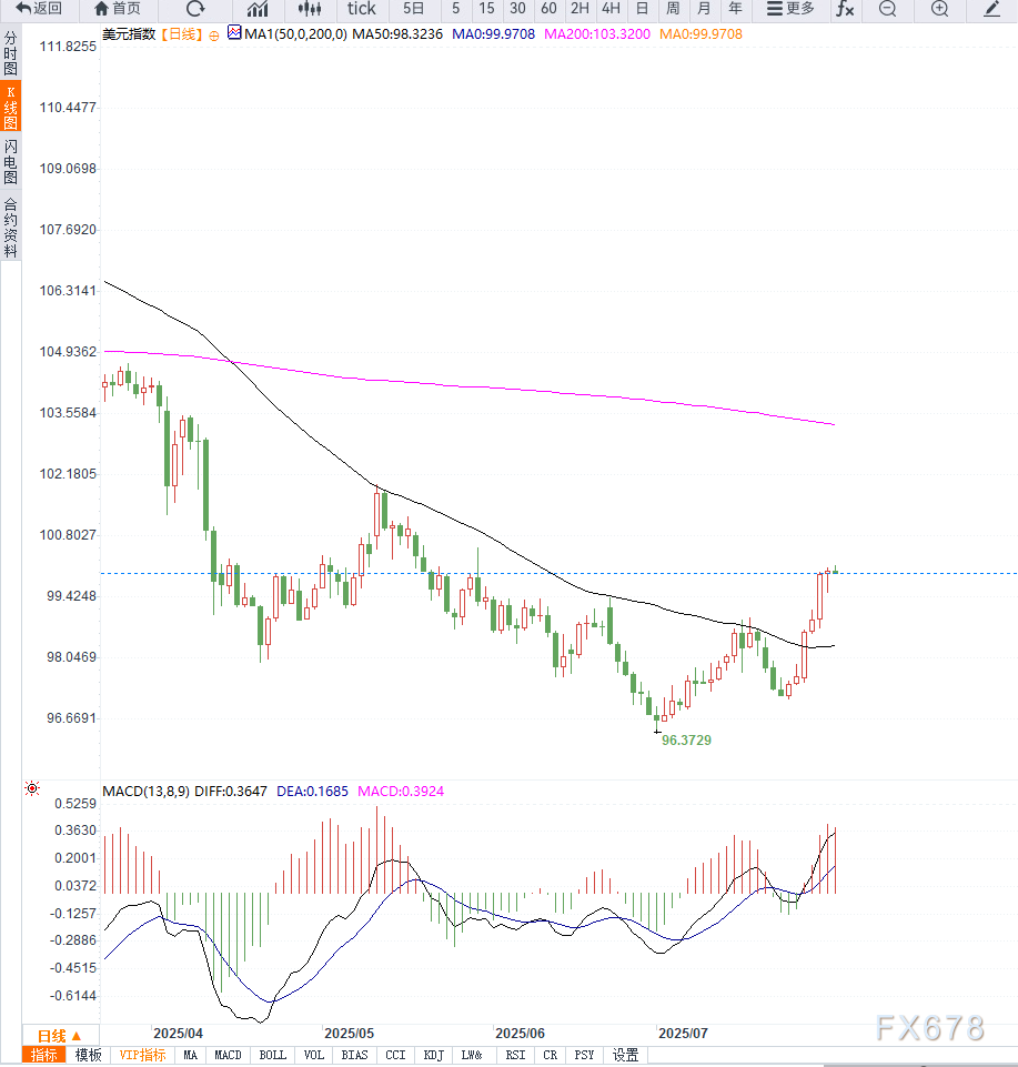 美元指数(DXY)周五亚市盘中维持强势,交投于100.00附近,接近周内创下的九周高点100.14,延续了连续七个交易日的涨势。 ![]() 与此同时,市场也在评估特朗普政府新一轮关税对全球经济与市场信心的潜在影响。根据行政命令,美国将自8月1日起对包括加拿大、印度等多个经济体的进口商品加征10%至41%的关税。 尽管关税政策理论上支持本国产业,但其对全球供应链和企业成本的影响仍存不确定性。 美劳工部发布的上周初请失业金人数为21.8万人,略低于市场预期的22.4万人,也低于前值21.7万,显示劳动力市场依旧稳健。 此外,投资者正密切关注即将公布的7月非农就业报告。若数据继续维持增长,将进一步支持美联储“按兵不动”的政策立场,并可能令美元延续上行趋势。 美元指数日线图显示,价格成功站稳在99.40的关键支撑位上方,并持续运行于短期与中期均线上方,技术结构偏多。当前MACD正处于多头放量阶段,RSI指标攀升至64附近,尚未进入超买区间,显示上涨仍有动能。 若突破100.20-100.30区间阻力,则下一目标有望指向101.00;而若失守99.40支撑,则短期涨势或陷入调整。 ![]() 本轮美元上涨是典型的“政策+数据”共振效应。高通胀数据对利率路径形成上推压力,加之就业数据保持弹性,使美元对其他主要货币形成较大吸引力。 若全球贸易担忧情绪持续升温,可能间接削弱全球经济动能预期,施压美元。 ![]() |