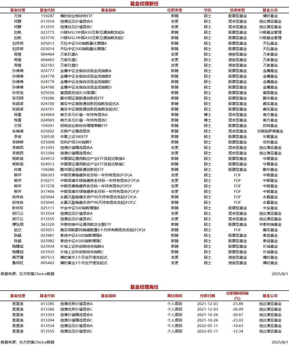 每经AI快讯,据东方财富Choice数据统计,今日新聘基金经理27人,涉及43只基金(A/C类分开计算),主要来自信达澳亚基金、中银基金等公司。另外,今日有1位基金经理离任。 ![]() |