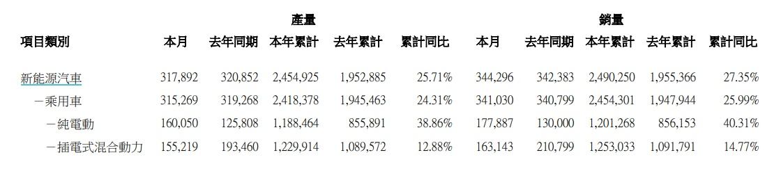 08月1日,比亚迪披露7月份产销快报。7月份,比亚迪新能源汽车销量为34.43万辆,去年同期为34.24万辆;今年累计销售为249.03万辆,同比增长27.35%。7月份,比亚迪新能源汽车产量为31.79万辆,今年累计生产245.49万辆 ...