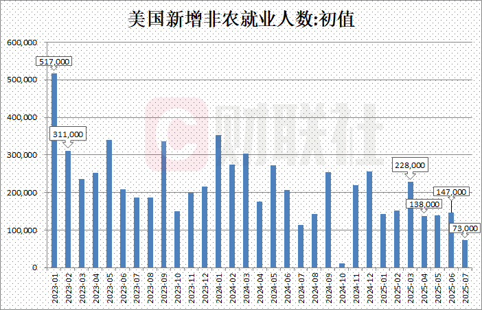 美国7月非农就业人数增加7.3万人,预估为增加10.4万人,前值为增加14.7万人。数据创9个月以来新低。 ![]() 美国7月失业率为4.2%,预期4.20%,前值4.10%。 美国7月平均每小时工资年率增加3.9%,预期增加3.8%,前值增加3.8%。 美国劳工统计局将5月份非农新增就业人数从14.4万人修正至1.9万人;6月份非农新增就业人数从14.7万人修正至1.4万人。修正后,5月和6月新增就业人数合计较修正前低25.8万人。 美国非农数据公布后,美交易员重新完全消化美联储十月份降息的情景。 期货市场暗示,交易员认为美联储在9月会议上降息25个基点的可能性为75%,而就业报告公布前为45%。