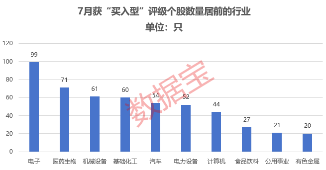 7月,机构积极关注10个行业。 7月市场活跃度大幅提升 上证指数7月累计涨幅达到3.74%,创近5年同期最高水平。从多项数据来看,市场活跃度被激发。 根据Wind数据,从成交活跃度来看,以市值计算,7月,A股市场日均换手率和日均成交额分别为3.84%和1.63万亿元,均创3月以来新高。 从融资资金来看,融资客7月净买入近1329亿元,创今年月度新高,且连续3个月处于净买入状态。 7月,北向资金成交额达到4.45万亿元,是6月的1.5倍,创今年月度新高。 ![]() 10个行业获机构扎堆评级 据证券时报·数据宝统计,7月,60家机构合计进行1482次“买入型”(包括买入、增持、推荐、强烈推荐、强烈买入)评级,合计覆盖720股。 从行业分布来看,720股广泛分布于31个行业,其中电子、医药生物、机械设备等10个行业股票数量均有20只及以上。 ![]() 电子行业个股数量多达99只,居首。7月,申万一级电子行业指数涨幅达到6.59%。今年以来,以半导体为主的电子行业公司业绩大幅反转,机构给予乐观预期。比如集微咨询预计,2025年国内半导体上市公司营收总额同比增长9%,达到9175亿元,近5年累计增长100%;净利润预计达513亿元,同比增长9%,近5年累计增长45%。 医药生物行业个股数量超过70只,居次席。申万一级医药生物行业指数7月涨幅接近14%。 今年以来,国产创新药频传重要进展。根据智慧芽生物医药披露,百济神州与安进合作开发的塔拉妥单抗(Tarlatamab)—— 全球首个CD3/DLL3 双抗药物,在国内提交上市申请;广生堂控股子公司福建广生中霖研发的乙肝一类创新药奈瑞可韦(GST-HG141),在树兰(杭州)医院完成III 期临床试验首例受试者入组给药。 国信证券表示,医保目录与商保创新药目录扩容提供经济支撑,海外授权及临床数据竞争力提升推动板块反转,推荐关注创新药及创新产业链。