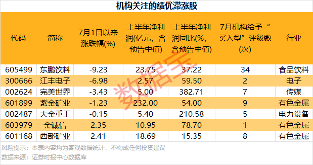 11股获机构重点关注 从具体个股来看,720股中,有64股7月获机构给予5次及以上“买入型”评级,11股获“买入型”评级不低于10次,东鹏饮料、药明康德、科沃斯获机构评级次数居前。 东鹏饮料7月获“买入型”评级多达34次,居首。国联证券表示,公司已初步构建起“双引擎+多品类”的多元化产品矩阵,正在成长为中国的综合性饮料集团,且海外布局仍在稳步推进,未来东南亚增量亦可期待。 药明康德获“买入型”评级达18次,居次席。 ![]() 7只绩优滞涨股获机构力荐为8月金股 截至8月1日,720股中,103股获机构推荐为8月金股,东鹏饮料、沪电股份、牧原股份等6股均获多家机构推荐。 上述103股中,东鹏饮料和江丰电子等7股7月以来股价跑输上证指数,且2025年上半年业绩同比增长(含半年报、业绩预告)。 从市场表现来看,7月1日以来,股价跌幅居首的是东鹏饮料,跌幅超过9%。公司2025年上半年净利润同比增长37.22%。国信证券表示,2025年上半年公司收入延续高增,且加大费投蓄力,考虑公司后续规模效益仍有望持续释放,年内盈利能力仍有望提升。 江丰电子7月以来股价跌幅接近7%。公司2025年上半年净利润增幅中值接近60%,东兴证券表示,公司研发持续加码,全面布局半导体精密零部件领域,国产替代加速打造第二成长曲线。 完美世界7月以来股价跌幅超过3%。公司今年上半年业绩扭亏,主要系公司自研新国风仙侠MMORPG端游《诛仙世界》于2024年12月上线,电竞业务实现稳健发展等因素所致。 大金重工7月以来股价微跌,2025年上半年净利润增幅中值超过210%。据此测算,公司今年上半年净利润增幅有望创2011年以来同期新高。东吴证券表示,公司多年布局海外市场厚积薄发,产能、资质、交付业绩铸造核心竞争力。此外,公司资金充裕,蓬莱产能具备先发优势,加速河北唐山基地产能布局。 西部矿业7月以来股价涨2.41%。公司2025年上半年净利润同比增长15.35%。2025 年上半年,公司矿产铜产量较上年同比增长7.65%;矿产铅同比增长24.63%;精矿含金产量较上年同比增长32.67%。 ![]() (文章来源:证券时报网) |