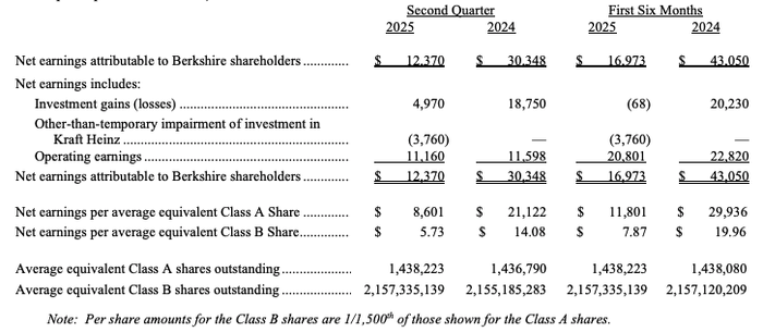 当地时间8月2日,沃伦·巴菲特旗下伯克希尔·哈撒韦公布,2025年第二季度营收925.15亿美元,上年同期936.53亿美元;归属于伯克希尔股东的净收益为123.70亿美元,上年同期303.48亿美元。 ![]()