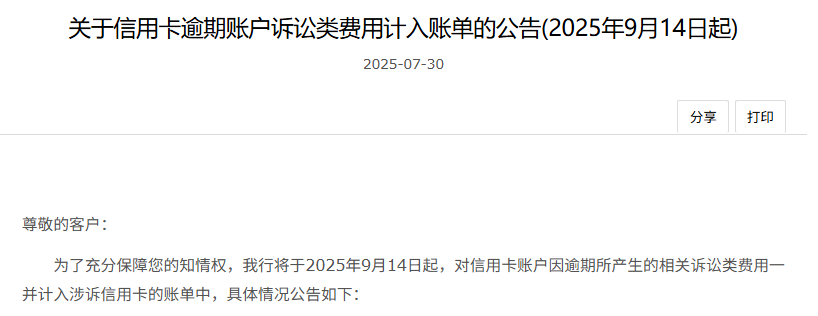 近日,有媒体称,一国有大行计划将信用卡逾期诉讼类费用计入涉诉信用卡的账单中,目前正在试点阶段。这则业务调整消息一出,立即引发行业热议。 8月1日,中国基金报记者获悉,该银行为中国银行。从中国银行发布的相关内容中可以看到,该行计划于2025年9月14日起,对信用卡账户因逾期所产生的相关诉讼费用一并纳入涉诉信用卡的账单中。 ![]() 信用卡逾期诉讼类费用 将计入涉诉的信用卡账单中 从适用范围看,对于尚未偿还及经司法程序认定需由持卡人承担的诉讼类相关费用多达十余项,包括但不限于诉讼费、仲裁费、财产保全费、差旅费、执行费、评估费、拍卖费、公证费、送达费、公告费、律师费等。 中国银行表示,计划将按照司法判决或仲裁裁决结果,逐笔或合计一笔(涉及上述多项费用时)计入涉诉的信用卡账单中。 不过,上述费用将不计收利息及违约金。目前中国银行将先以上海为试点展开实施,再逐步向其他地区推广。 据中国基金报记者了解,从9月14日起,中国银行上海分行长宁支行将率先试点开展这一调整。中国银行上海分行自10月11日起调整,其他地区分行将从10月19日起展开试点工作。 这一行业罕见的调整,让多位银行从业者直呼“陌生”。8月1日,针对这一业务调整的相关细节,中国基金报记者致电了中国银行公告所示的信用卡客服热线,相关客服人员表示“已获悉这一业务调整情况”。