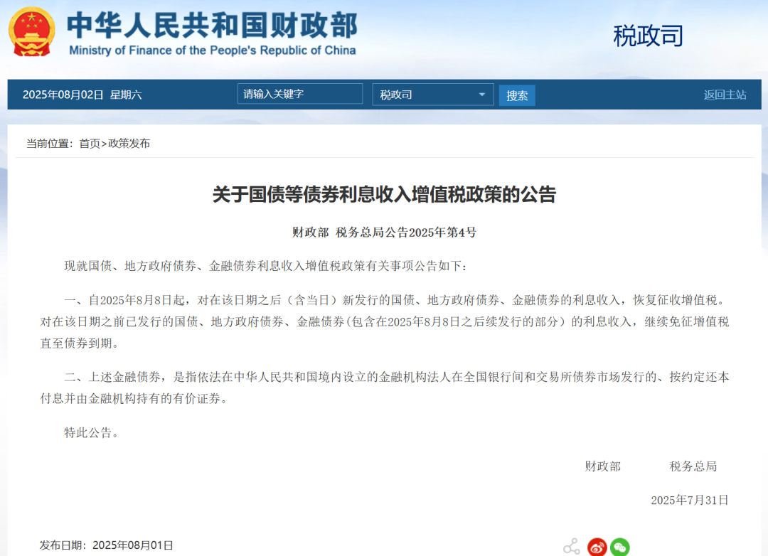 0事关债券利息征税,新政策来了! 8月1日,财政部、税务总局联合发布《关于国债等债券利息收入增值税政策的公告》。 公告显示,自2025年8月8日起,对在该日期之后(含当日)新发行的国债、地方政府债券、金 ...