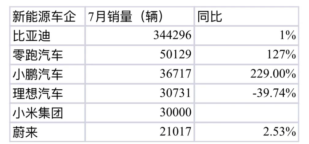 8月1日,专注新能源汽车领域的主要上市公司发布2025年7月销量数据。最新“成绩单”显示,比亚迪7月销量同比增长0.6%,环比下降8.8%。另外,造车新势力公司中,在港交所上市的零跑汽车和小鹏汽车再创单月交付纪录。 中国汽车流通协会认为,尽管7月末受汛期高温及多雨天气影响,包括新能源汽车在内的短期汽车消费需求受到抑制,但随着开学季购车需求逐步释放,叠加车企促销活动以及成都等多地车展相继启动,对终端销量形成一定拉动,预计8月整体市场表现将好于7月。 ![]() 主要新能源汽车公司7月销量数据 ![]() 比亚迪发布的7月销量数据 零跑汽车和小鹏汽车大幅增长 8月1日,零跑汽车披露,公司7月全系交付达50129辆,同比增长超126%,零跑汽车月销量首次突破5万辆,也是连续五个月位居造车新势力交付榜首。目前,零跑汽车旗下共有七款车型在售,得益于公司坚持全栈自研的经营策略,零跑汽车在性价比上颇具竞争力。7月23日新上市的零跑B01新车,共推出6款车型,售价区间仅为8.98万至11.98万元,下探9万元以下。 零跑汽车高级副总裁兼COO徐军透露,目前,全新一代C11、B01两款新车型助力整体订单的大幅增长。其中B01订单截至上周末已经过万,也再次点燃了B10的销量。“工厂仍保持满产的节奏以应对持续增长的订单需求。” 零跑汽车董事长朱江明近日提出明确目标:2025年公司要确保50万辆销量达成,长远计划成为年销400万辆的世界级电动车企。公司产品矩阵将按“C-B-D-A”序列逐步完善,形成全价位覆盖。 小鹏汽车8月1日披露,公司7月共交付新车36717辆,同比增长229.45%;1月—7月,累计交付233906辆,同比增长270.26%。按计划,全新小鹏P7将于8月6日迎来首秀。在海外市场,7月中旬,小鹏汽车在欧洲市场推出了2025款小鹏G6和G9,并宣布即将在欧洲推出小鹏P7+。随着2025年上半年进入英国、意大利、爱尔兰及其他新市场,小鹏汽车已进入了全球46个国家和地区。 小鹏汽车董事长何小鹏近期表示,公司2025年第四季度实现盈利“绝对不是挑战”,2025年的经营成果将会超出外部预期。 根据蔚来数据,7月,公司交付新车21017辆,前七个月同比增长25.2%。其中,蔚来品牌交付新车12675辆,乐道品牌交付新车5976辆,firefly萤火虫品牌交付新车2366辆。蔚来董事长李斌表示,乐道L90和蔚来全新ES8两款新车将有望引领大三排SUV车型进入纯电时代。 根据理想汽车数据,7月,公司交付新车30731辆,出现了近40%的同比下滑。理想汽车相关负责人表示,由于销售组织架构调整等原因,7月销量出现波动。