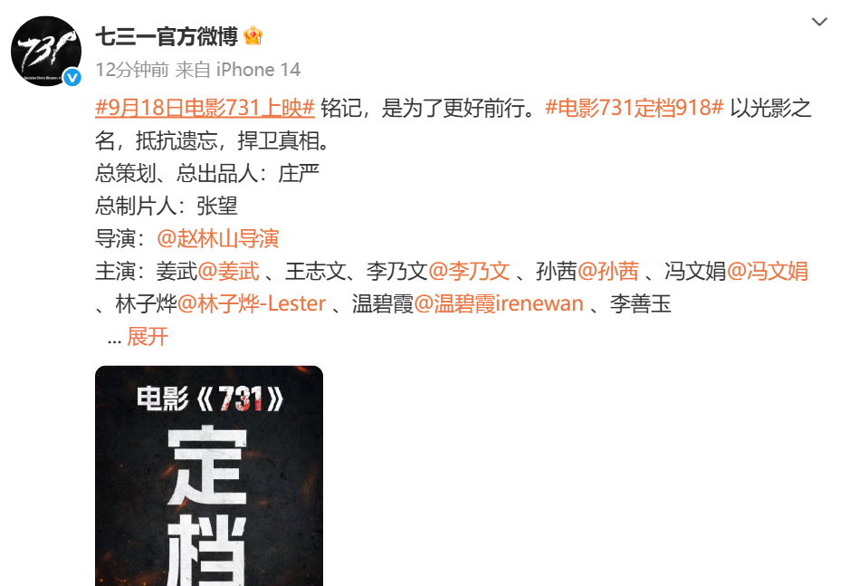电影《731》定档9月18日