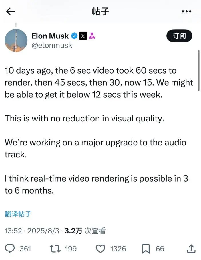 08月3日消息,马斯克最新透露,Grok Imagine一段6秒的视频渲染已缩短至15秒,实时视频渲染技术有望在3到6个月内实现。 马斯克自曝正在对音频轨道进行重大升级 8月3日,马斯克转发了关于Grok Imagine的最新 ...