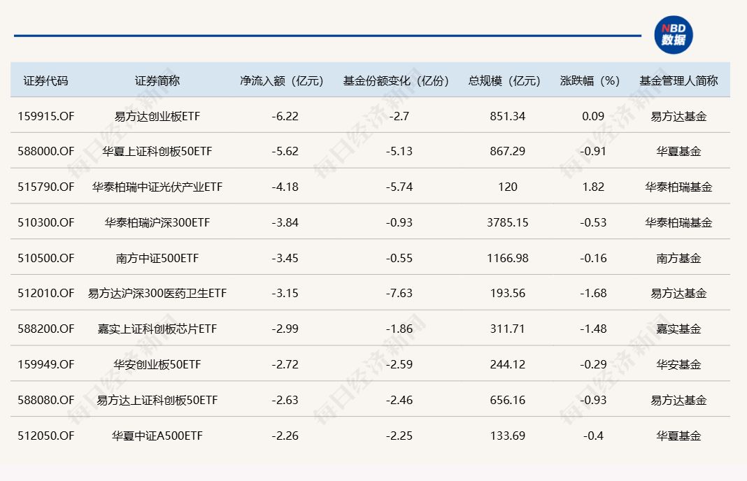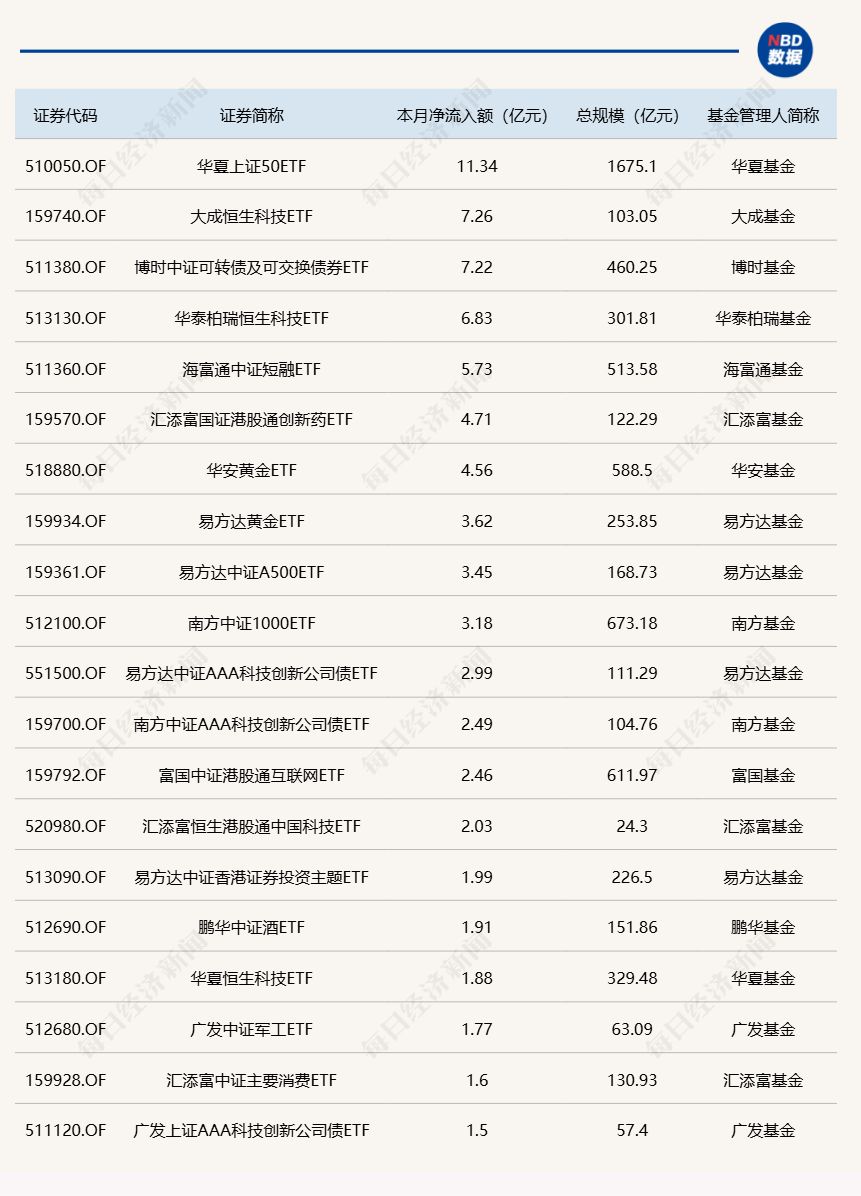 每经记者|赵云 每经编辑|肖芮冬 上周五(8月1日),市场全天震荡调整,三大指数小幅收跌。板块方面,中药、电力设备、AI智能体、造纸等板块涨幅居前,中船系、民爆、PCB、CPO等板块跌幅居前。 Wind数据显示,在8月1日的非货币ETF市场中,华夏上证50ETF份额增加3.93亿份,净流入额为11.34亿元;大成恒生科技ETF份额增加9.99亿份,净流入额为7.26亿元;博时中证可转债及可交换债券ETF份额增加0.57亿份,净流入额为7.22亿元。