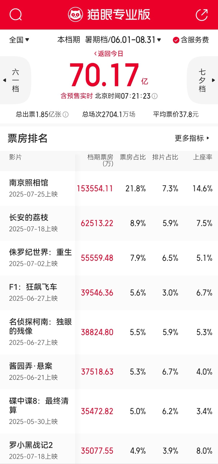 0据央视新闻援引网络平台数据,截至8月3日24时,单日电影票房破3.8亿元,创2025年暑期档电影单日票房新高。2025年暑期档(6月-8月),电影总票房(含预售)已突破70亿元。 至此,2025年暑期档单日票房已连续两 ...