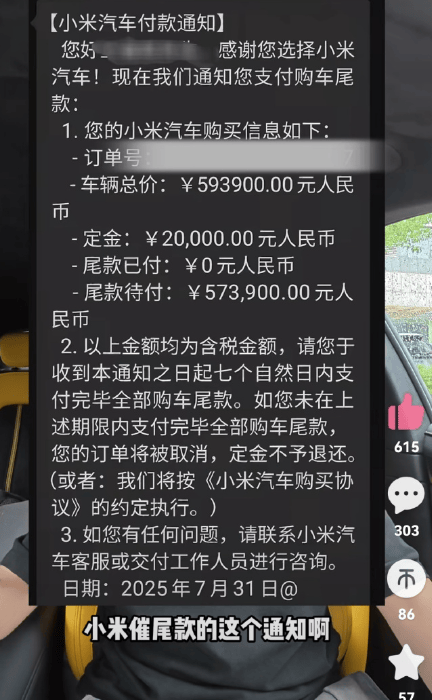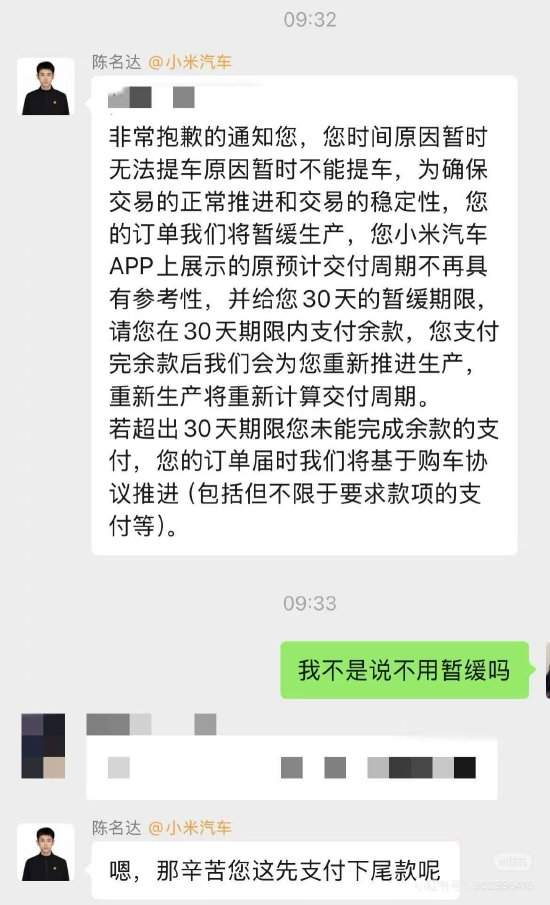 近日,有多为网友在社交平台爆料称,购买小米汽车交付定金后,被销售要求提前支付尾款,否则面临订单取消、定金不退的风险。