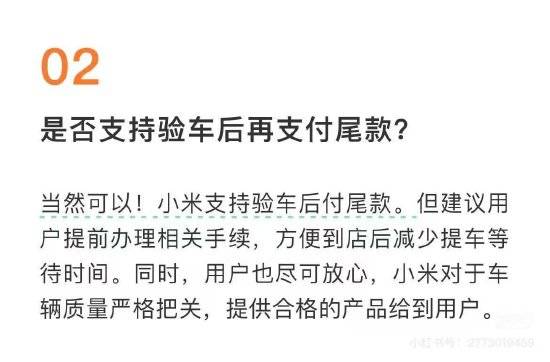据小米汽车购买协议,用户收到车辆余款支付通知之日起7个自然日内需要支付全部剩余款项。锁定订单后,小米汽车有权根据车辆生产安排或销售等情况随时通知用户支付余款。未按期足额支付或拒绝支付余款的行为构成根本性违约,小米汽车有权取消订单并解除本协议,且已支付的定金不予退还。 该条款是购车过程中“必须要同意”的,否则无法完成购车流程,有多位消费者质疑此为霸王条款。 但同时,小米汽车官方公众号曾明确表示小米支持验车后再付尾款,但建议用户提前办理相关手续,方便到店后减少提车等待时间。