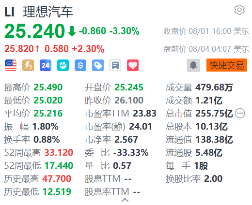 0格隆汇8月4日|理想汽车(LI.US)盘前涨2.3%,报25.82美元。消息面上,理想汽车近日推出理想i8,32.18万元起,8月20日正式开启交付。多家机构发