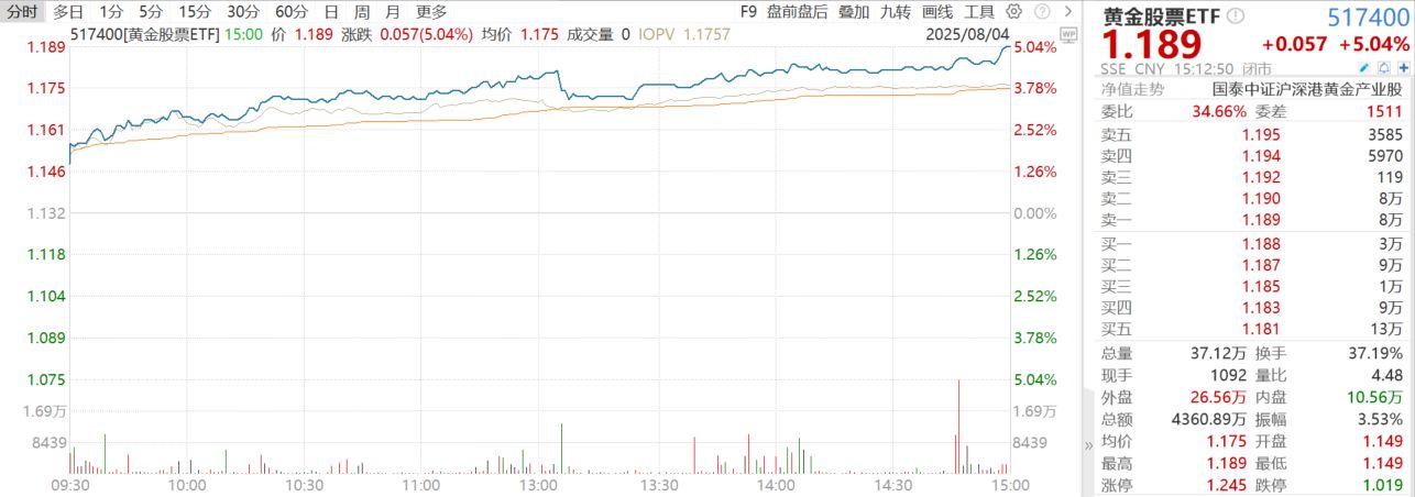 【上涨原因分析】美国非农就业数据意外转弱,金价回暖 美国非农就业数据意外转弱:7月非农数据不及预期,5月和6月数据被大幅下修。美国7月非农新增就业人数7.3万人,低于预期的10.4万人,6月从14.7万下修至1.4万,5月从14.4万下修至1.9万,累计下调25.8万。7月劳动参与率为62.2%,低于预期和前值。7月失业率为4.2%,符合预期,高于前值。 美国劳工统计局(BLS)解释数据大幅下修原因,一是季调因子调整,二是问卷回收率变化(即后续收到更多的问卷,获得更全面的数据)。从这一角度看,此次7月非农问卷回收率只有58%,数据准确性也堪忧。 非农数据转弱表明,一方面美国就业形势不如市场预期,或给近期市场风险偏好的提升带来一定压制;另一方面,数据公布后美元、美股走低,金价抬升。未来联储内部支持降息的声音或增强,同时白宫可能给联储施加更多的政治压力来推动降息。市场对于9月降息预期升温,利好金价。 【后市展望】黄金中长期逻辑不变 过去3-4个月,由于关税担忧缓和、关税对美国经济和就业的冲击未显现,联储并不急于降息,因而金价上涨动能逐步减弱;但就业数据走弱给了美联储降息理由,后续或看到联储官员发言倾向鸽派。若市场开启降息交易,对于金价可能有一定利好,需继续关注美联储货币政策走向及美国经济数据。 近期美国新一轮关税表出炉,将对未达成协议的国家征收10%至41%不等的关税。 关税对通胀影响尽管避免了极端情形,但由于“基础关税”已经普遍加征,目前的关税税率仍然高于之前,激进的关税政策依然放大了美国经济陷入“通货膨胀与经济停滞并存”的“滞胀”风险。同时政策的反复加剧了市场不确定性,对于金价也有一定支撑。同时,特朗普“逆全球化”关税政策主张也可能会一定程度上促进央行购金趋势。 此外,近期特朗普签署稳定币GENIUS法案。美国政府合法化稳定币可能对于美元信用产生持续影响,进而对于金价有一定影响。一方面,若稳定币的发展有效支撑美元信用,分流黄金对冲主权货币贬值风险的需求,对黄金可能有一定利空影响;但另一方面,若在稳定币发展进程中出现预期之外的信用风险(例如2022年算法稳定币曾出现崩盘风险),则可能推高全市场风险溢价,对黄金构成利好。可持续关注后续发展历程及相应影响。 长期看,在货币超发及财政赤字货币化背景下,美元信用体系受到挑战;加上全球地缘动荡频发推动资产储备多元化,黄金作为安全资产的需求持续提升。全球“去美元化”的趋势使得黄金有望成为新一轮定价锚,使得贵金属有望具备上行动能。央行购金趋势仍在持续,中国央行公布最新黄金储备数据显示,6月末黄金储备7390万盎司,环比继续增加7万盎司,这是中国央行连续第八个月增持黄金。后续可持续关注地缘政治形势、全球宏观经济走势及全球央行购金情况。 黄金股票整体走势与金价走势呈正相关的关系,金价上涨有望为黄金股票贡献利润弹性。黄金股票ETF(517400)的标的指数是中证沪深港黄金产业股票指数,覆盖黄金采掘、冶炼、销售等全产业链环节,也包含黄金珠宝板块公司,有望受益于新消费催化。当前黄金股票的估值处于历史中低水平,投资者可以关注黄金股票ETF(517400),把握黄金全产业链的投资机会。 此外,黄金基金ETF(518800)直接投资在实物黄金上,价格或者净值的走势与国内黄金价格走势相同。感兴趣的投资者也可以布局黄金基金ETF(518800)。