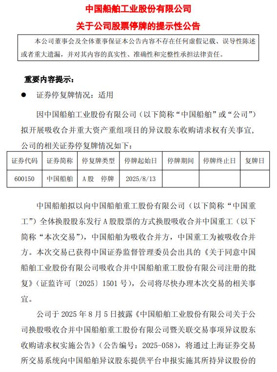 中国船舶8月4日公告,公司拟开展吸收合并重大资产重组项目的异议股东收购请求权有关事宜,公司股票将自2025年8月13日开市起连续停牌,并将于刊登异议股东收购请求权申报结果公告当日复牌。