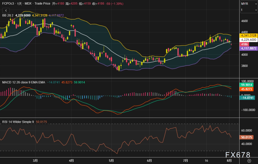 周一 8月4日 马来西亚衍生品交易所 BMD 棕榈油主力合约FCPOc3收跌1 39 报4186林吉特 吨 盘中技术指标呈现多空交织态势 布林带 20 2 中轨位于4341林吉特 而RSI 14 暂稳于50 01中性区间 市场情绪明 ...