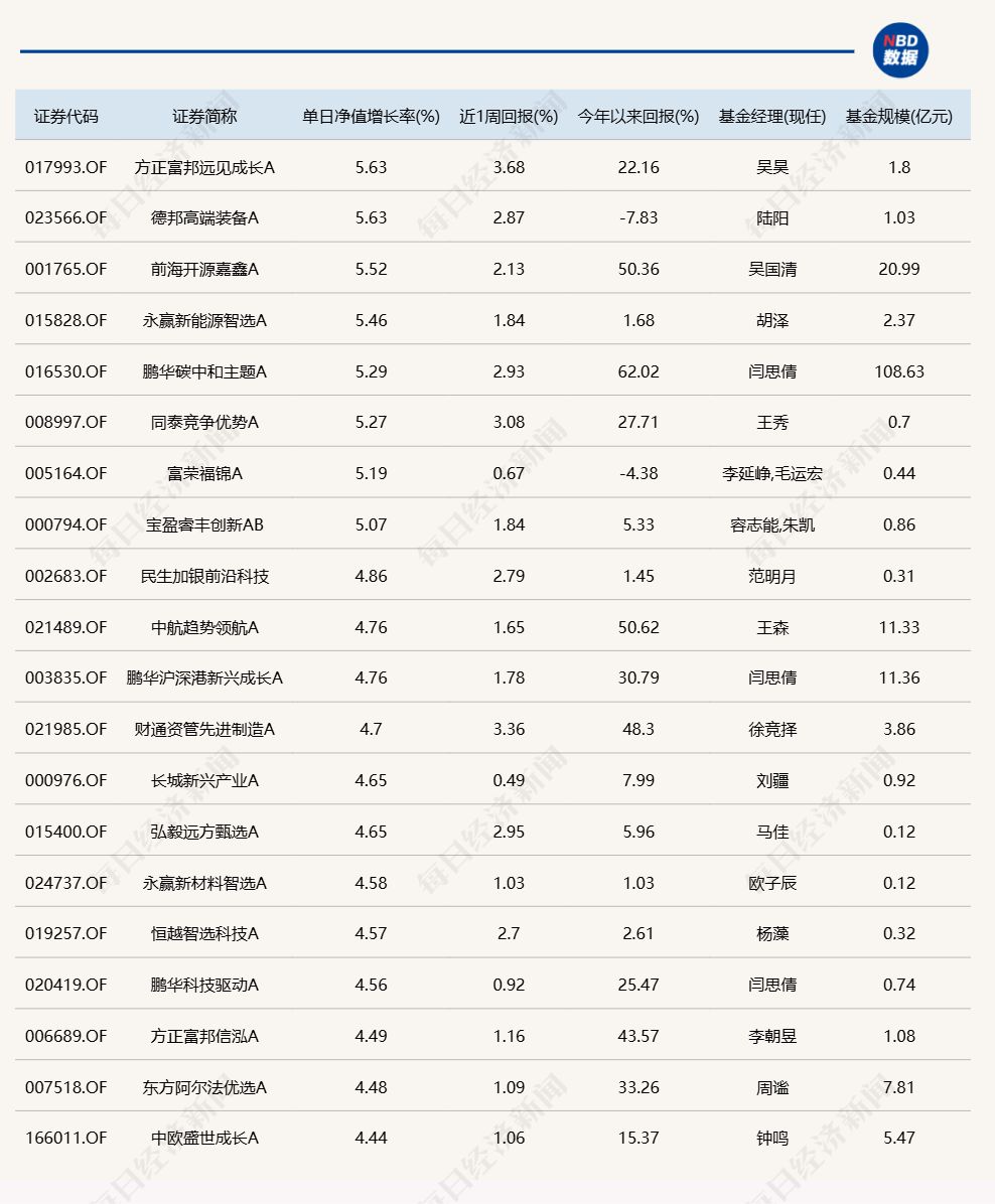 每经记者|肖芮冬 每经编辑|赵云 8月4日,市场全天低开后震荡反弹,三大指数小幅上涨。板块方面,军工、贵金属、人形机器人、商业航天等板块涨幅居前,保险、影视、光伏、零食等板块跌幅居前。个股涨多跌少,全市场超3800只个股上涨。沪深两市全天成交额1.5万亿元,较上个交易日缩量998亿。 下面一起来看今天公募基金的表现。 (注:榜单1、榜单2仅选取灵活配置型、偏股混合型和普通股票型三类产品作为主动基金的代表,纳入统计;债基相关榜单包括各类主、被动债券型基金) 1.单日涨幅榜