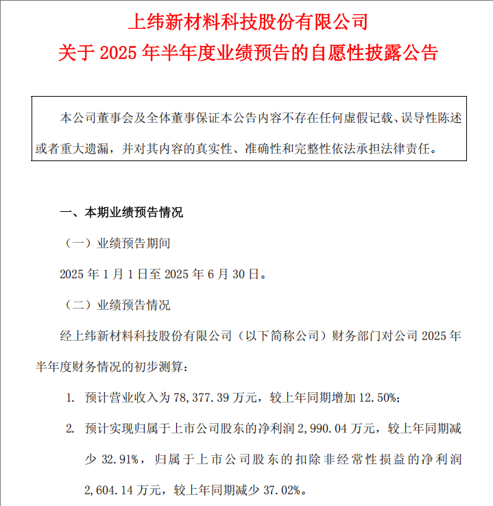 08月4日晚间,上纬新材公告称,公司股票计划自8月5日开市起复牌。公司同时披露,预计2025年上半年的归母净利润、扣非后净利润,同比分别下降32.91%、37.02%。 上纬新材此前因股价异动,自7月31日开市起停牌。7 ...