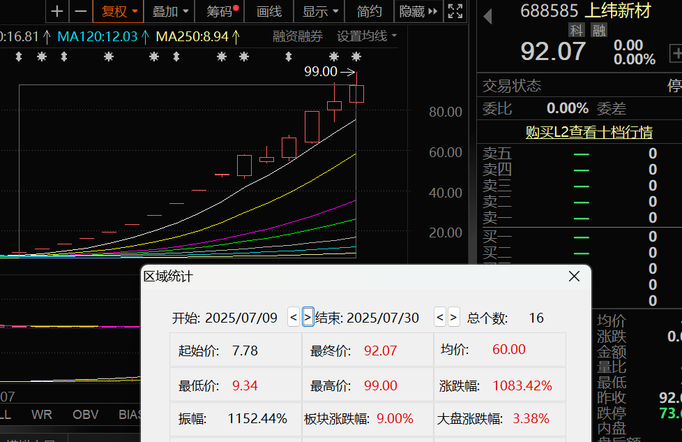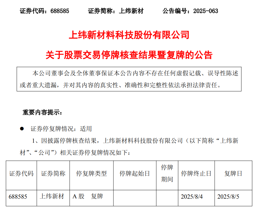 8月4日晚间,上纬新材公告称,公司股票计划自8月5日开市起复牌。公司同时披露,预计2025年上半年的归母净利润、扣非后净利润,同比分别下降32.91%、37.02%。 ![]() 上纬新材此前因股价异动,自7月31日开市起停牌。7月9日至7月30日,上纬新材的股价涨幅累计达1083.42%,成为今年A股首只涨幅超十倍的股票。 上纬新材公告称,目前,公司基本面未发生重大变化,但近期公司股票交易价格,已严重脱离公司目前的基本面,投资者参与交易可能面临较大的市场风险。