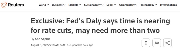 英国路透社周一 8月4日 发布独家报道称 旧金山联储主席戴利 MaryDaly 周一表示 鉴于越来越多的证据表明美国就业市场正在走软 且没有出现持续的关税驱动通胀的迹象 降息时机已经临近 截图来源 路透社 戴利谈到美联储 ...