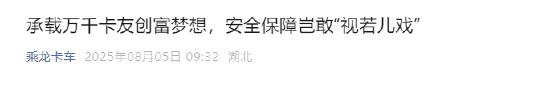 乘龙卡车微信公众号8月5日发文,承载万千卡友创富梦想,安全保障岂敢“视若儿戏”。这已经是理想i8碰撞测试风波后,乘龙卡车连续6天发文回应此事。