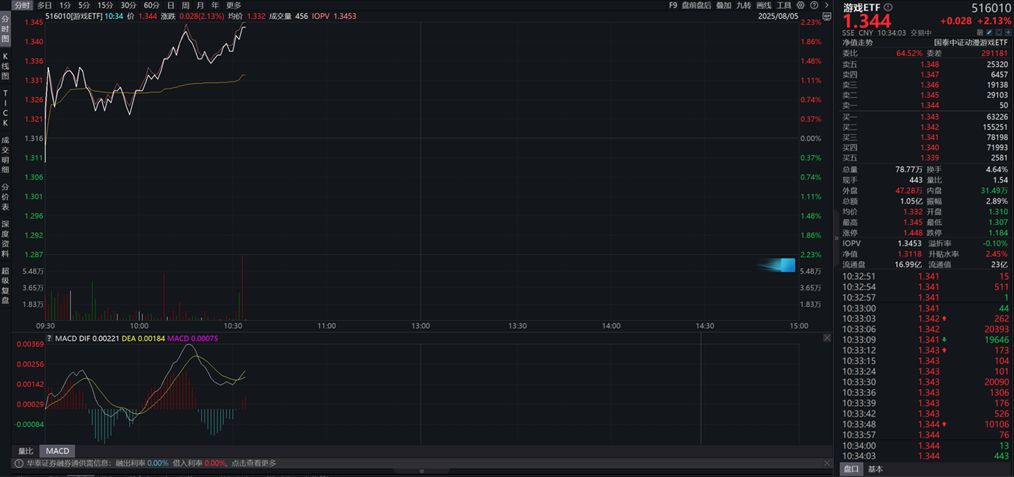 每经编辑|赵云 据伽马数据,2025年1-6月国内游戏市场实际销售收入1,680.00亿元,同比增长14.08%,游戏用户规模为6.79亿,同比增长0.72%,均创历史新高。 受高景气催化,游戏板块强势领涨,相关产品游戏ETF(516010)盘中涨超2%。