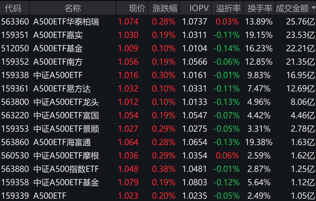 每经记者|叶峰 每经编辑|肖芮冬 市场早盘震荡分化,三大指数涨跌不一,中证A500指数上涨0.25%。 截至上午收盘,场内38只跟踪中证A500指数的ETF小幅上涨。其中,有14只中证A500相关ETF成交额超1亿元,4只超21亿元。A500ETF华泰柏瑞、A500ETF嘉实、A500ETF基金早盘成交额分别为25.76亿元、23.53亿元、22.21亿元。 有券商表示,8月为半年报披露高峰,谨防部分高估值题材股面临的业绩验证压力,未来市场有望集中于科技成长与周期制造两条主线。预计A股市场短期以稳步震荡上行为主,仍需密切关注政策面、资金面以及外盘的变化情况。