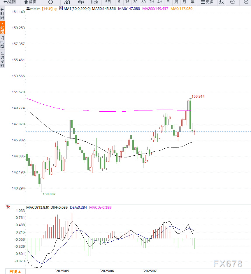 日元兑美元周二亚洲时段小幅回落,尽管日本国内经济数据改善,但市场避险情绪降温及美国政治因素支撑美元反弹,令美元兑日元保持在147.00关口上方震荡。 ![]() 日本执政党在7月20日的地方选举中失利,引发市场对未来财政政策转向的担忧。反对党主张扩大政府支出与减税,这可能迫使央行在调整政策前更加谨慎。日本央行行长植田和男上周也淡化了通胀风险,表态将继续维持“耐心”政策立场。 在此背景下,美元兑日元短线获得支撑,但中期走势面临美联储政策前景的不确定性。尽管美元受市场避险情绪支撑,但美国非农就业数据疲弱,强化了9月降息的预期。CME FedWatch工具显示,市场对9月降息的押注超过80%,全年降息幅度预期高达65个基点。 “上周疲软的非农报告打击了美元,特朗普政府解雇劳工统计局负责人,并迫使美联储理事Kugler辞职,市场担忧美联储独立性受到侵蚀。”——据市场调查显示。 此外市场风险偏好回暖,令日元等避险资产需求降低,也对日元形成间接打压。投资者当前将关注美国ISM服务业PMI数据以及美联储官员最新讲话,以判断美元后市方向。 日线图上,美元兑日元在从7月低点反弹后回落至147关口附近,在50%斐波那契回撤位146.85上方获得支撑,并短线企稳。若汇价突破147.35及147.75(38.2%回撤位)区域,则有望挑战148.00整数关口,一旦站稳,短期底部结构将确立,或吸引更多买盘介入。 相反,若跌破146.85,可能测试146.60亚洲时段低点,进而下探146.00甚至145.85附近(61.8%回撤位)。日线指标保持中性,表明当前市场多空仍在拉锯。 ![]() 当前美元兑日元面临“双重不确定”:一方面,日本政策逐步收紧,但政治不确定性限制其节奏;另一方面,美联储受经济数据与政治干预的双重压力,可能提前进入宽松周期。 美元兑日元在技术上短期仍有支撑,但上行空间受限。后市关注美国通胀与就业后续数据是否进一步疲软,以及日本央行是否加速政策转向。 ![]() |