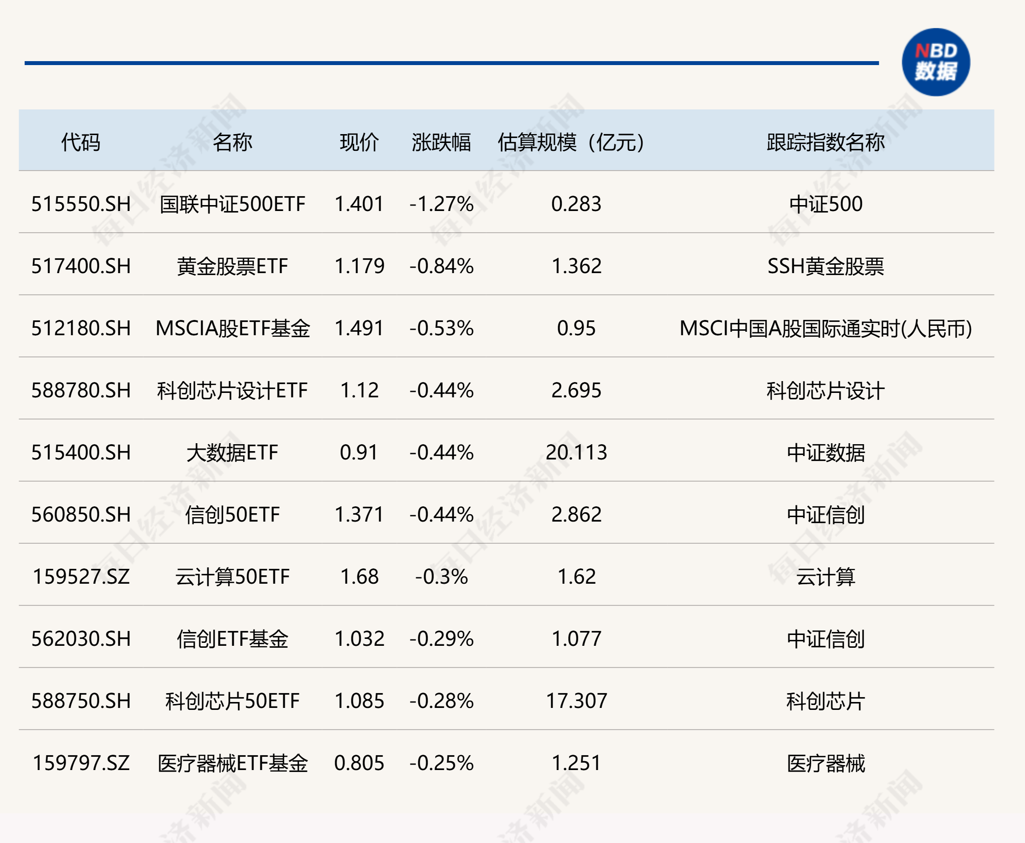 有券商表示,我国创新药研发数量已居全球第一,且部分领域研发技术领跑全球;创新药BD出海爆发,有效化解了创新药市场拓展及融资双难题。整体而言,受临床刚需支撑、研发技术突破、政策加大扶持、融资去泡沫化等因素刺激,我国创新药市场发展态势向好,市场规模有望持续扩容,原始创新、商业化能力持续提升。 下跌方面,国联中证500ETF跌超1%。
