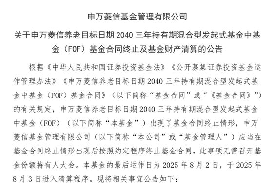 值得一提的是,虽然养老目标基金今年都是正收益,但是有些产品的收益比较低,比如国联养老目标日期2045三年持有,这只成立于2022年10月的基金,今年前7个月的收益仅有0.5%。 按照合同约定,该基金目前权益类资产比例在34%-59%,中枢值在49%,也就是说,这只目标日期型产品目前大致相当于一只平衡混合型基金。 不过显然,前7个月权益方面并没有给基金净值带来比较明显的正向贡献,从一季报和二季报也可以看出,两个季度全部跑输比较基准。 基金经理在二季报中表示:“由于4月上旬权益市场的大幅波动,出于对绝对收益的考虑,产品在投资策略上略偏谨慎,导致季度收益率略弱于基准。” 又一只养老目标基金清盘其他产品方面,近日又有养老目标基金清盘。 申万菱信基金公告称,截至2025年8月2日日终,申万菱信养老目标日期2040三年持有期混合型发起式(FOF)的基金资产规模低于两亿元,触发基金合同约定的终止情形,基金将根据约定终止基金合同并进入基金财产清算程序,无需召开基金份额持有人大会审议。