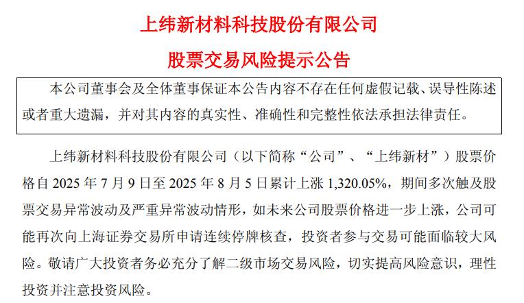 08月5日晚间,上纬新材发布股票交易风险提示公告:公司股票价格自2025年7月9日至2025年8月5日累计上涨1320.05%,期间多次触及股票交易异常波动及严重异常波动情形。如未来公司股票价格进一步上涨,公司可能再次向 ...