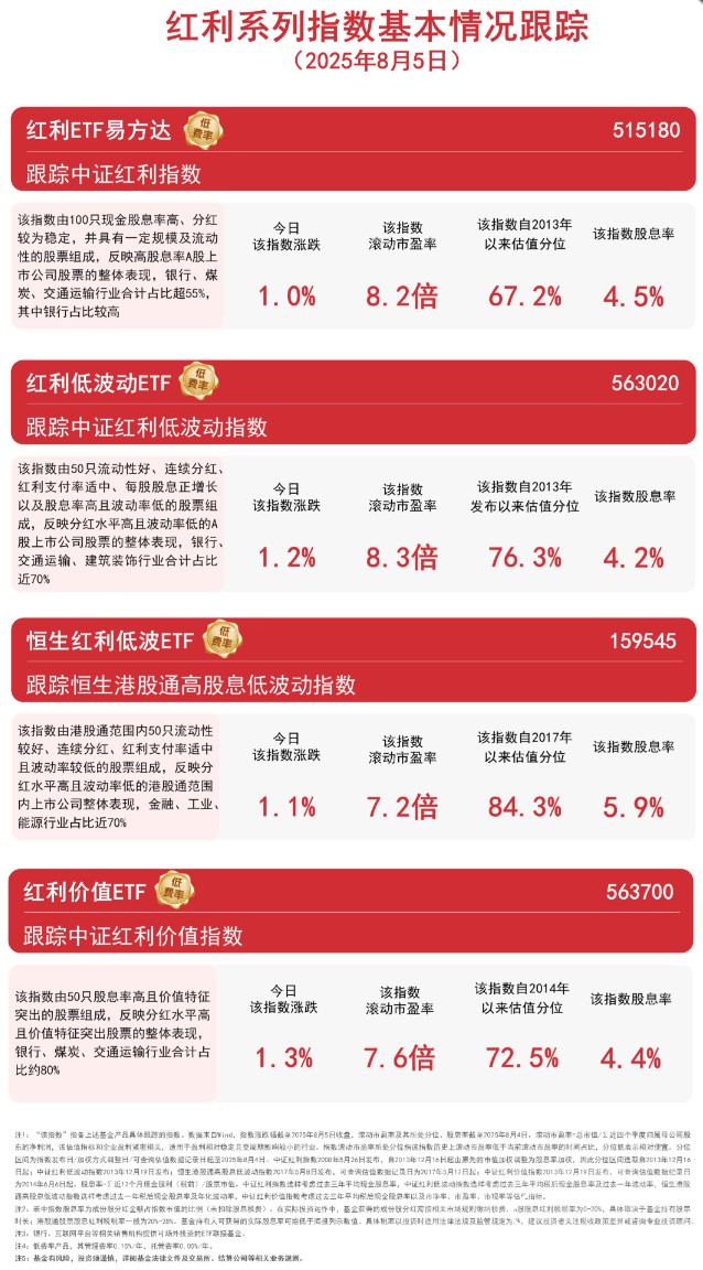 今日红利系列指数集体涨超1%,截至收盘,中证红利价值指数上涨1.3%,中证红利低波动指数上涨1.2%,恒生港股通高股息低波动指数上涨1.1%,中证红利指数上涨1.0%。Wind数据显示,恒生红利低波ETF(159545)今日获3300万份净申购,截至昨日,该产品近一月“吸金”近15亿元,最新规模近40亿元。 招商证券表示,在当前低利率的环境下,红利资产收益相对较高且稳定,成为投资者关注的重点;政策引导中长期资金入市,进一步提高了红利资产长期配置需求。