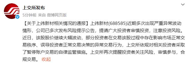 上纬新材(688585)近期多次出现严重异常波动情形,公司已多次发布风险提示公告,提请广大投资者审慎投资,注意投资风险。近日,该股股价继续大幅波动,部分投资者在交易该股过程中存在影响市场正常交易秩序、误导投资者正常交易决策的异常交易行为,上交所依规对相关投资者采取了暂停账户交易的自律监管措施。上交所再次提醒投资者关注风险,审慎参与,合规交易。