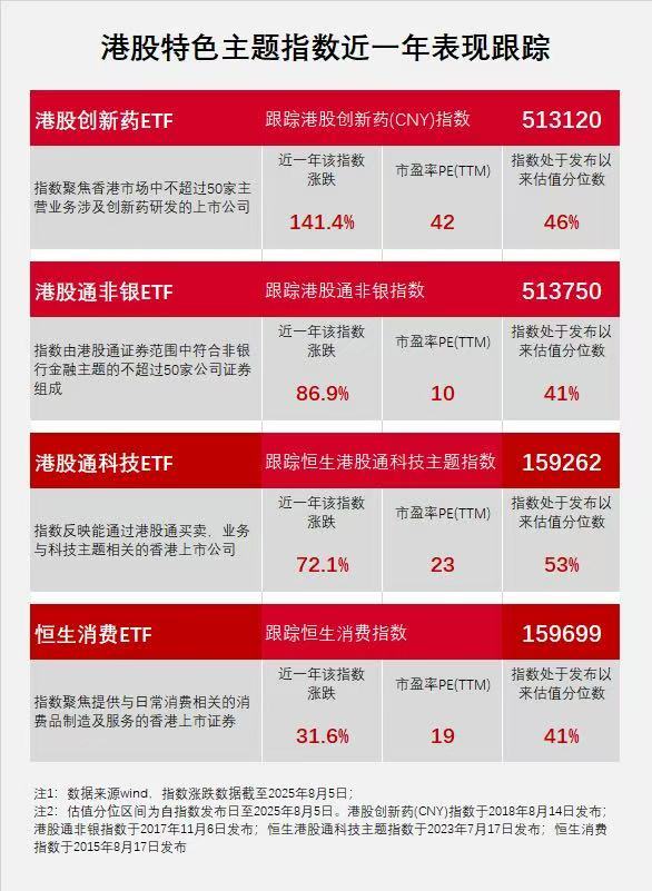 港股7月再度上涨,其中恒生指数和恒生科技指数涨幅均超过2.8%,恒生港股通涨幅达4.7%。上行走势也持续吸引资金买入。7月,港股通流入1252亿元人民币,较6月增超70%。业内人士表示,今年以来,港股市场迎来内资与外资的共振式流入,港股资金面持续宽松。 如何把握港股后市投资机会?国信证券最新研报指出,从周期涨幅、AH溢价率及宽基指数估值三大维度比较,港股相对A股仍处于合理估值区间,投资上重点关注几大方向:估值仍较低的互联网与AI龙头、预期反转持续发酵的港股创新药、受益于“反内卷”的资源与大宗商品、基本面持续强势的新消费,以及业绩持续改善的非银金融机构。 业内人士表示,与前述方向关联度较高的品种,如港股通科技ETF(159262)、港股创新药ETF(513120)、恒生消费ETF(159699)及港股通非银ETF(513750)等,聚焦单一赛道,具有高纯度特征,是投资者把握相关机会的高效工具。 具体来看,聚焦“AI+Semi”纯科技主线的港股通科技ETF(159262)紧密跟踪恒生港股通科技主题指数(HSSCITI.HI),指数覆盖小米、腾讯、中芯国际等30家纯科技企业,前十大成分股权重达75%,“软硬兼备”特性突出。行业分布上,该产品剔除医药、家电等非科技板块,为投资者提供了锐度更高的纯科技赛道工具。Wind数据显示,港股通科技ETF自7月7日上市以来上涨超13%,明显跑赢同期恒生科技指数5.8%的涨幅,超额达7.2个百分点。目前,该指数市盈率TTM为23.5倍,处于历史52%分位,估值适中。 此外,年内收益翻倍的港股创新药ETF(513120)同样值得关注,其年内收益超102%,最新规模突破165亿元再创历史新高,不仅是全市场规模最大的创新药ETF,也是年内全市场规模最大的“翻倍基”。领先的业绩弹性得益于较高的产品纯度,其跟踪中证香港创新药指数,集中布局信达生物、药明生物等龙头,生物制药与化学药权重占比高达92.5%。从估值看,当前该指数市盈率TTM为41.80倍,处于历史45.33%分位,估值仍具备较好性价比。 机构同样看好港股新消费领域机遇。恒生消费ETF(159699)跟踪恒生消费指数(HSCGSI.HI),成分股包括泡泡玛特、老铺黄金等50家港股消费龙头,指数PE仅18.91倍,处于近5年24.14%分位,估值具备一定安全边际。与A股800消费指数侧重白酒不同,该指数更贴合Z世代消费潮流,个股分布均衡,单只个股的权重上限10%,为投资者提供了精准布局新消费的配置选择。 非银金融板块以其亮眼的表现,同样吸引了资金的广泛关注。Wind数据显示,全市场唯一跟踪港股通非银金融指数的ETF——“孤品”港股通非银ETF(513750)连续11周获资金净买入,最新规模超127亿元,再创新高,近1年收益率达92.58%。港股通非银ETF(513750)险企含量居前,其标的指数申万二级保险行业权重超过64.5%,覆盖中国平安、友邦保险等龙头险企,此外还有港股券商(权重15.2%)和港股稀缺资产港交所(权重13.3%)。当前指数PE约10倍,处于历史40%分位,估值优势显著。 综合来看,在港股估值修复与资金面宽松的双重驱动下,上述四只ETF分别覆盖科技、创新药、新消费及非银金融四大核心赛道,兼具规模流动性优势、高纯度特性与交易便利性,为投资者提供了一系列布局港股机遇的便捷工具。机构分析指出,随着“反内卷”政策深化及全球通胀预期升温,港股科技与医药板块的中长期配置价值尤为突出,而新消费与非银的业绩改善趋势亦有望延续,建议投资者结合自身风险偏好,适时把握细分领域机会。