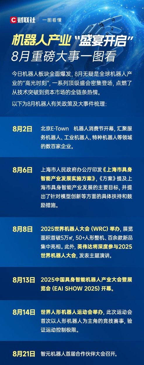 8月无疑是全球机器人产业的一个“高光时刻”,一系列顶级盛会密集登场,一图速览。 (文章来源:财联社)