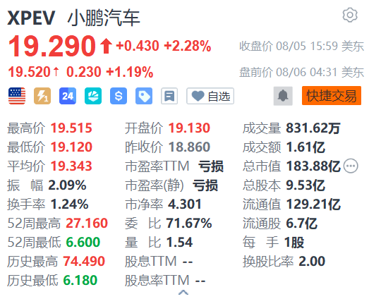 0格隆汇8月6日|小鹏汽车(XPEV.US)盘前涨1.19%,报19.52美元。消息面上,今晚7点,全新一代小鹏P7正式发布。何小鹏微博称:这是一台时尚的豪华轿跑