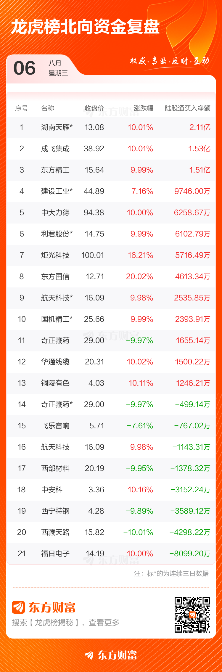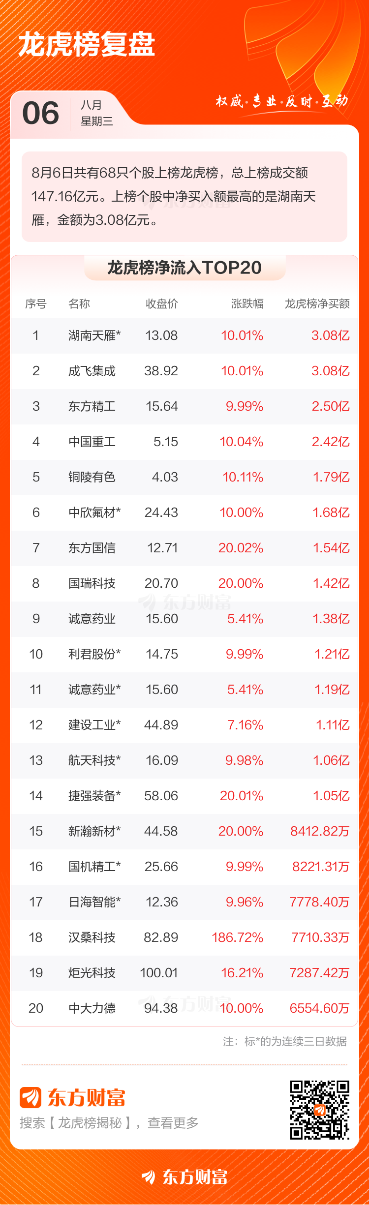 08月6日共有68只个股上榜龙虎榜,总上榜成交额147.16亿元。上榜个股中净买入额最高的是湖南天雁,金额为3.08亿元。 当天,游资席位净买入金额最高的个股是东方国信,“成都系”净买入1.33亿元。 免责声明: ...