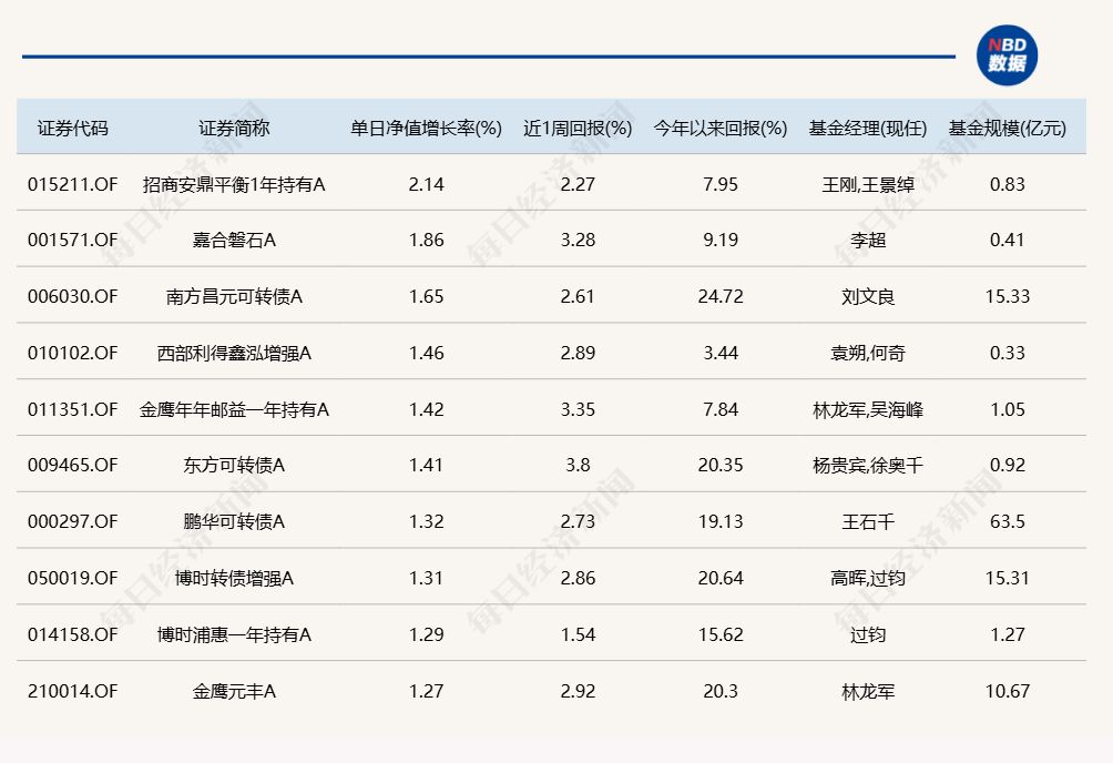 每经记者|肖芮冬 每经编辑|赵云 8月6日,市场全天震荡走高,三大指数小幅上涨。板块方面,PEEK材料、军工、人形机器人、光刻机等板块涨幅居前,中药、西藏、创新药、旅游等板块跌幅居前。全市场超3300只个股上涨,近百股涨超9%。沪深两市全天成交额1.73万亿元,较上个交易日放量1380亿。 下面一起来看今天公募基金的表现。 (注:榜单1、榜单2仅选取灵活配置型、偏股混合型和普通股票型三类产品作为主动基金的代表,纳入统计;债基相关榜单包括各类主、被动债券型基金) 1.单日涨幅榜