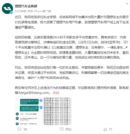 8月7日理想汽车法务部官方微博发文称,近期收到多位车主举报,反映各网络平台集中出现大量针对理想车主负面评价的误导性信息,极大损害了理想汽车用户形象,致使理想汽车用户线上线下生活遭受严重侵扰。 文章指出,经核查,此类负面信息24小时不间断在多平台密集发布,具有多频次、内容高度同质化等特征,涉嫌有组织的违法犯罪。以8月3日为例,自0时至早7时,仅1个平台就集中出现45篇以《以前真没注意,理想车主,没有意外,一律乱停车…#理想车主》为主题的相同视频。即便是凌晨时段,大量密集地攻击仍未收手,直到现在,还未停止。这一行为背后的黑力量,在挑战社会的良知和法律的底线。 理想汽车称,正在固定相关证据,将坚决通过平台投诉、发起民事诉讼、刑事报案等一切法律途径追究其法律责任,维护广大用户和公司合法权益。