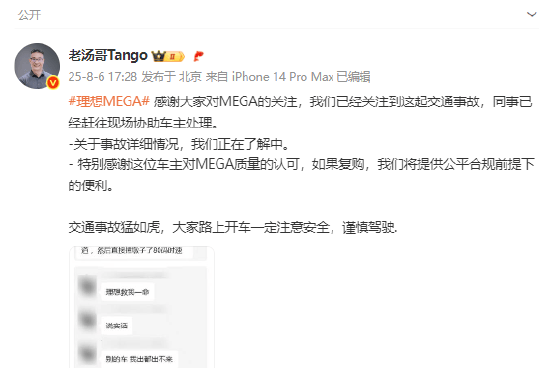 据汤靖贴出的图片显示,该车主称称,“理想救我一命,说实话,别的车我出都出不来。我还跑回车里拿东西,很轻松开门,正常开门。” 该车主还表示,还会考虑(购买)理想MEGA。