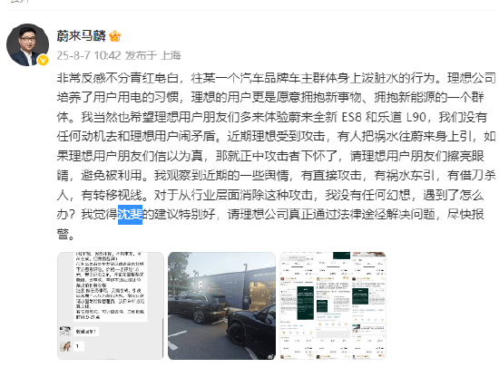 蔚来品牌与传播助理副总裁马麟8月7日微博发文称,非常反感不分青红皂白,往某一个汽车品牌车主群体身上泼脏水的行为。理想公司培养了用户用电的习惯,理想的用户更是愿意拥抱新事物、拥抱新能源的一个群体。 他指出,当然也希望理想用户朋友们多来体验蔚来全新 ES8 和乐道 L90,我们没有任何动机去和理想用户闹矛盾。近期理想受到攻击,有人把祸水往蔚来身上引,如果理想用户朋友们信以为真,那就正中攻击者下怀了,请理想用户朋友们擦亮眼睛,避免被利用。 他观察到,近期的一些舆情,有直接攻击,有祸水东引,有借刀杀人,有转移视线。“对于从行业层面消除这种攻击,我没有任何幻想,遇到了怎么办?我觉得沈斐的建议特别好,请理想公司真正通过法律途径解决问题,尽快报警。”