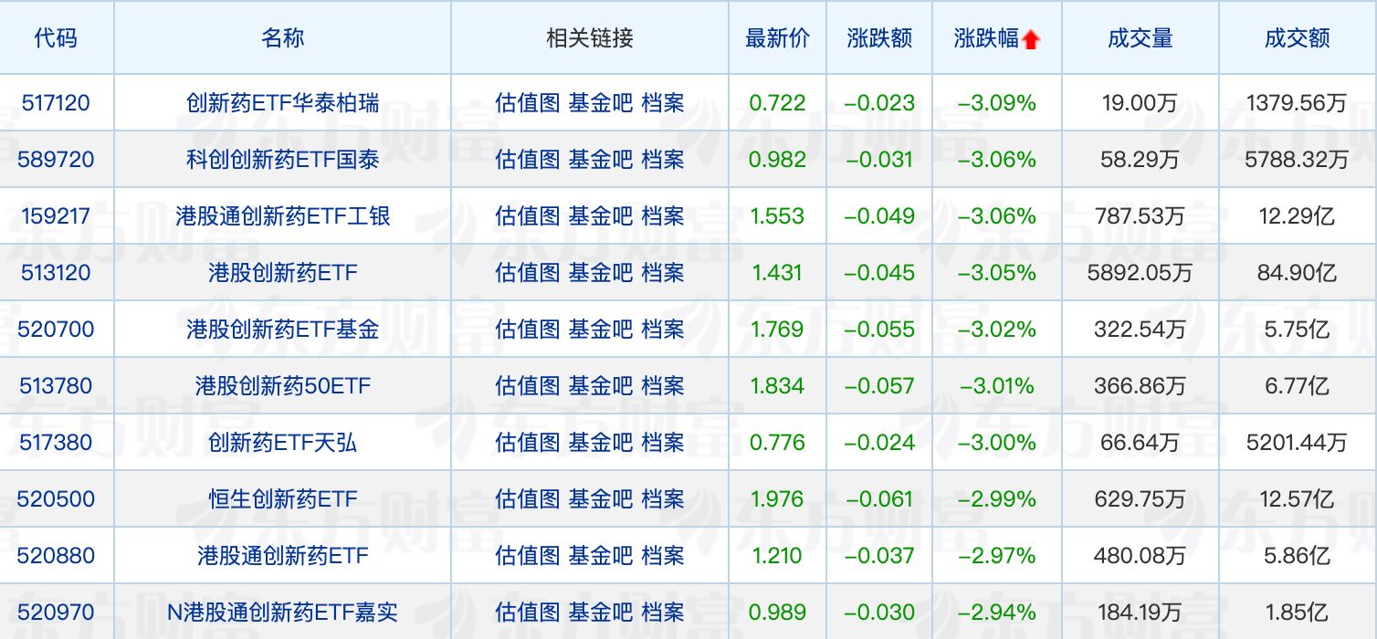 下跌方面,港股创新药相关ETF集体回调,最大跌幅3.09%。
