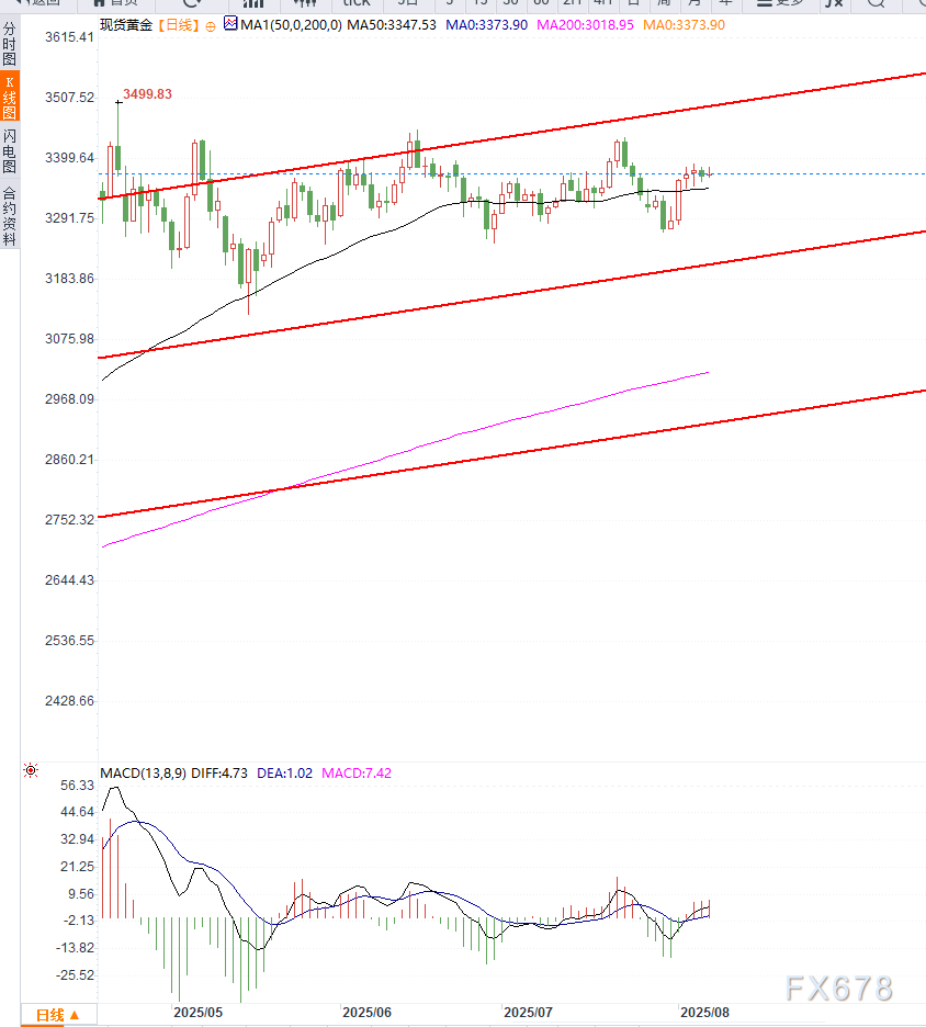 在避险买盘和宽松预期双重支撑下,黄金价格于周四亚市反弹,逆转前一交易日的跌势。现货金(XAU/USD)交投于3375美元一线,接近关键技术阻力位3400美元。投资者重新评估贸易局势与美国货币政策路径,为金价提供上行动力。 ![]() 与此同时,市场对美联储将在9月启动新一轮降息周期的预期迅速升温。上周五公布的美国非农就业数据低于预期,加上本周二发布的ISM服务业PMI疲软,推动投资者加大对年内降息的押注。 根据CME FedWatch工具显示,目前市场预期美联储9月降息25个基点的概率超过90%,并认为年内至少还有两次降息可能。 “对于黄金而言,利率预期转向宽松等同于降低了持有无息资产的机会成本,因此构成支撑。”——据市场调查显示。 不过,美元在触及一周低点后出现温和反弹,以及华尔街股市隔夜上涨,令金价上行受限。当前市场风险情绪仍相对积极,未完全转向避险格局,这也解释了黄金反弹幅度受限的原因。 黄金价格在3380美元上方震荡整理,短期多头正在尝试突破3400美元关键阻力位。从日线图看,价格已多次测试3380-3385美元区间,表明该区域存在强阻力。当前MACD与RSI指标表现分化,显示市场多空分歧加剧。 4小时图则更具积极信号:本周金价成功从200周期均线反弹,若价格突破3400美元,将确认短期上涨趋势延续,目标位依次指向3420-3422美元区间,强阻力区域则位于前高3434-3435美元附近。一旦突破,或将向历史高点3500美元迈进。 下方支撑方面,3350美元构成短期防线,若跌破则将测试3315美元一线。进一步支撑见于3300美元整数关口,若失守将引发更多技术性抛压,甚至回撤至3268美元的月内低位。 ![]() 当前金价走势显著受宏观政策与地缘事件驱动,尤其是特朗普政府将能源与关税政策交织使用的做法,正持续增强黄金作为避险资产的吸引力。然而,美元走势与市场整体风险偏好的干扰亦不可忽视。 技术面关键位3400美元正成为多空角力的焦点,突破与否将决定金价能否重新迈向3500美元历史高位。重点关注即将公布的美国初请失业金人数与美联储官员讲话。 ![]() |