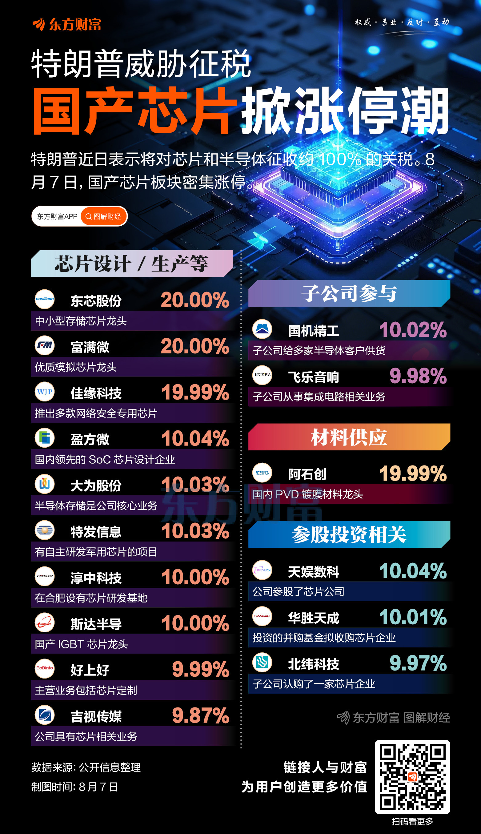 0国产芯片概念在8月7日掀起了涨停潮,东芯股份、富满微、阿石创、佳缘科技、盈方微、斯达半导等十多股涨停。 消息面上,据证券时报报道,美国总统特朗普在当地时间8月6日表示,美国将对芯片和半导体征收约100% ...