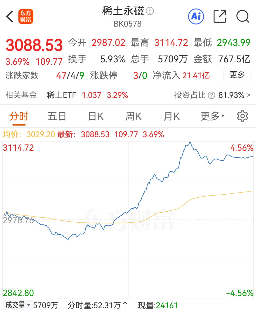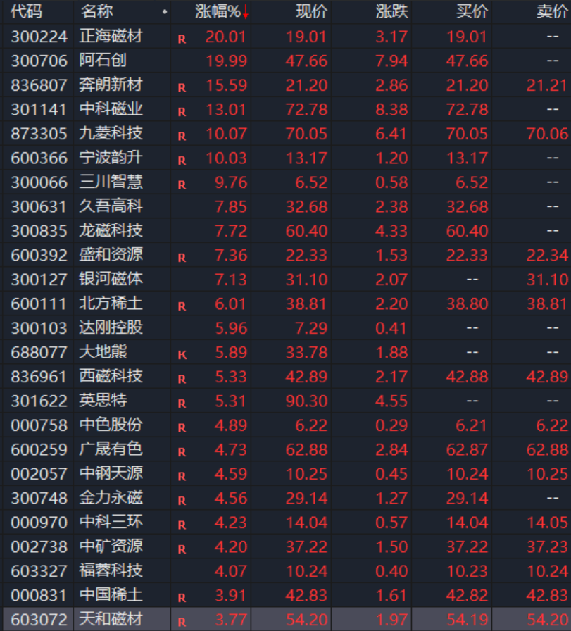 稀土股,午后异动! 继半导体板块拉升后,稀土永磁概念股午后也集体异动,宁波韵升率先涨停,正海磁材、中科磁业、奔朗新材等多股直线拉升。 日前,稀土永磁板块迎来一则好消息:国内首条稀土盘式电机智能示范线投产,6毫米超薄永磁电机问世。据悉,这条示范线的成功落地,标志着我国在高端稀土永磁电机研发与产业化上迈出关键一步。 有券商认为,中国从稀土资源开发到稀土永磁产业链,规模和技术均全球领先,具有国际定价权。看好稀土产业链在需求增长和涨价带动下的投资机会。 稀土永磁概念股拉升 8月7日午后,稀土永磁概念股大幅拉升,板块指数涨幅一度超过4.5%,截至下午收盘时,该板块的整体涨幅仍达到3.69%。个股方面,阿石创、正海磁材20cm涨停,宁波韵升10cm涨停,奔朗新材涨超15%,中科磁业、九菱科技涨超10%,三川智慧涨近10%,龙磁科技、盛和资源、银河磁体涨超7%,北方稀土涨超6%,包钢股份、中国稀土等涨超3.5%。 ![]() ![]() 厚度6毫米的稀土永磁电机研制成功的消息,在业内引发关注。科技日报6日报道称,从内蒙古包头市的稀土新材料技术创新中心获悉,国内首条稀土盘式电机智能示范线在该中心建成投产。其首款成熟产品——厚度仅6毫米的稀土永磁轴向磁通电机,以突破性高性能引发业界关注。这条示范线的落地,标志着我国在高端稀土永磁电机研发与产业化上迈出关键一步,为全球产业竞逐打开了全新赛道。 据介绍,这条示范线下线的微型稀土永磁电机,功率3瓦,厚度仅6毫米,较同类产品体积锐减60%,重量降低80%,却拥有每分钟4500—5500转的额定转速、约15毫牛·米的最大扭矩以及70%以上的最高效率,堪称“小身材大能量”的典范。 “研发团队正全力推进第二代产品及自动化生产线工艺的升级迭代。”项目组成员闫亮介绍。研发团队透露,稀土新材料技术创新中心已与国内知名车企达成合作意向,该产品将率先应用于汽车智能座舱散热系统。未来,其应用场景将延伸至消费电子产品、空调服、无人机及机器人关节模组等领域。 据报道,作为包头市加快建设“两个稀土基地”创新链的关键平台,该示范线预计今年底实现量产,年产能可达50万台。闫亮表示,这条示范线的建成是产学研用深度融合的成果,使微型电机领域迎来一场静悄悄的革命,将为全球稀土永磁电机产业技术升级注入新动能。 机构:看好稀土相关产业链 8月7日,海关总署发布的数据显示,中国在7月份出口了5994.3吨稀土。2025年1至7月,稀土累计出口量38563.6吨,同比增长13.3%。同时,7月份,中国进口了9622.7吨稀土,1—7月的累计稀土进口量为67013.4吨,相较去年同期下降16.8%。 从基本面来看,湘财证券指出,上周,稀土精矿价格上行态势不改,轻稀土矿涨幅较大。据百川盈孚,上周国内混合碳酸稀土矿、四川氟碳铈矿及山东氟碳铈矿价格分别上涨9.68%、11.11%和13.64%,进口独居石矿价格上涨4.23%,美国矿价格上涨11.54%。上周国内中钇富铕矿价格上涨2.02%,进口缅甸离子型矿价格上涨0.96%。另据Wind数据,上周氧化镨钕均价上涨3.31%,镨钕金属均价上涨3.55%。 上述券商表示,稀土环节,镨钕供给端紧张持续,因进口美国矿及缅甸矿等原料供应有所减少,同时废料价格居高,成本端支撑较强;总量控制指标暂未明确,但整体收紧政策大势下预计全年供应趋于紧张。 需求端,三季度终端订单陆续下达,钕铁硼企业开始备库,国内订单支撑尚可,而出口管制方面陆续有放宽的趋势,整体需求稳中有增。供应持续紧张,需求稳中有增,短期价格支撑较强导致市场看涨情绪增强,预计后市仍将维持上涨趋势。相关稀土资源企业有望受益稀土资源价格上涨带来的机会。中长期角度,随着稀土价格稳步回升,下游磁材企业盈利有望持续修复。 国金证券认为,反内卷下战略资源价格亟待重估,供应收缩预期逐步加强,匹配出口有望逐步恢复,价格向上趋势奠定;《稀土管理条例》正式落地伴随系列政策逐步拉开行业供改大幕,头部央企有望受益,板块有望迎来业绩估值双升。 稀土永磁主要应用于汽车、消费类电子、机器人和白色家电等领域。尤其是新能源汽车和变频家电的需求牵引下,高性能稀土永磁需求不断增长,未来人形机器人和eVtol的发展将极大地增加高性能稀土永磁的需求。 太平洋证券表示,中国从稀土资源开发到稀土永磁产业链,规模和技术均全球领先,具有国际定价权。当前,稀土产品价格合理,有望进一步上涨。看好稀土产业链在需求增长和涨价带动下的投资机会。